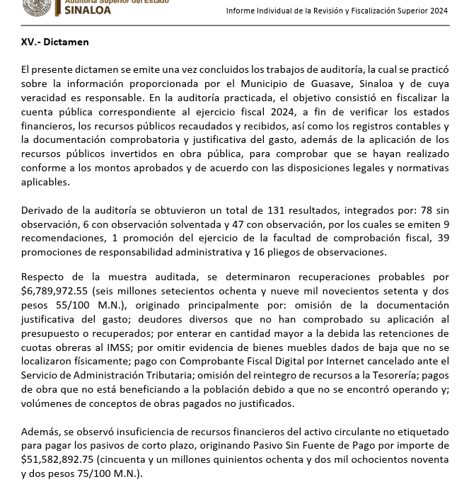 Culiacán.- El Informe Individual de la Revisión y Fiscalización Superior 2024, elaborado por la Auditoría Superior del Estado de Sinaloa (ASE), confirma que la administración de Martín Ahumada Quintero heredó a Guasave una situación financiera crítica, con pasivo sin fuente de pago, recuperaciones probables y pagos injustificados a un despacho de cobranza, comprometiendo la capacidad financiera del Ayuntamiento.