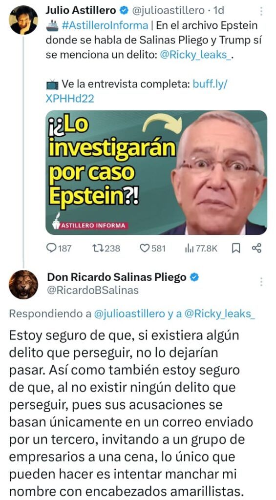 El nombre del empresario mexicano Ricardo Salinas Pliego aparece en 26 documentos dentro de la liberación masiva de archivos vinculados a la investigación del caso Jeffrey Epstein, difundidos por el Departamento de Justicia de Estados Unidos el 30 de enero de 2026.