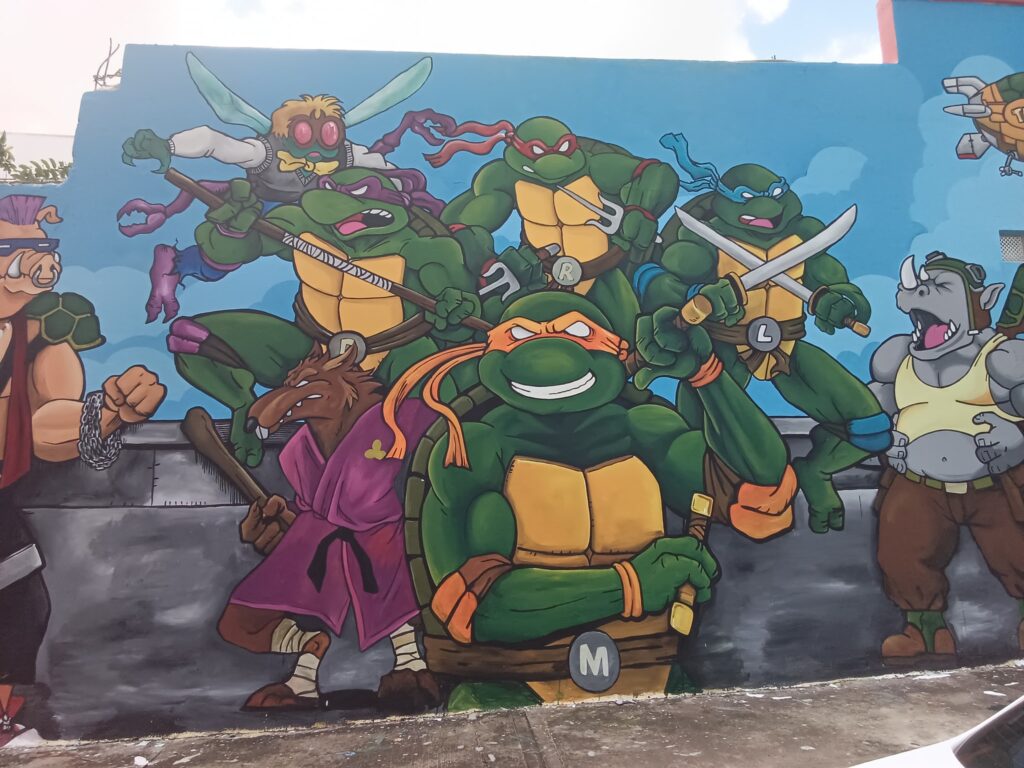 La obra más reciente de Gustavo está inspirada en su amor por las Tortugas Ninja, personajes que marcaron su infancia y que ahora plasma en un mural lleno de color y nostalgia.