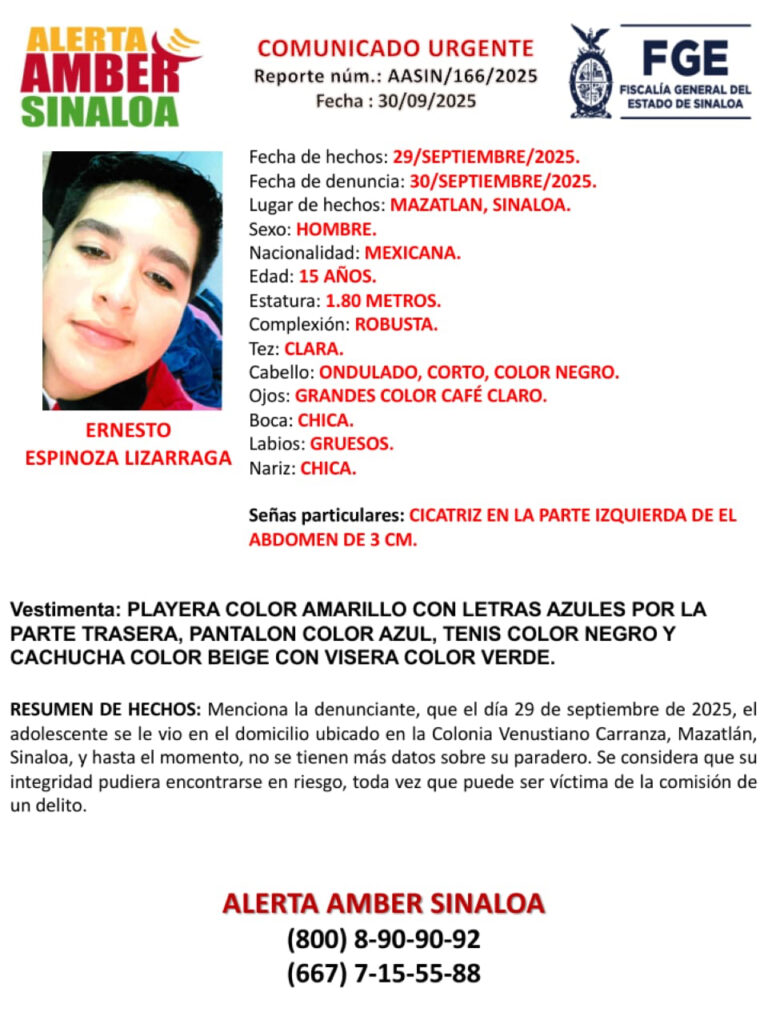 La Fiscalía General del Estado de Sinaloa (FGE) ha emitido una Alerta Amber de carácter urgente para solicitar la colaboración ciudadana en la localización de Ernesto Espinoza Lizárraga, un adolescente de 15 años reportado como desaparecido en Mazatlán, Sinaloa.