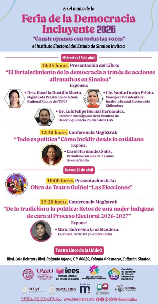 Con el objetivo de fortalecer la participación ciudadana y avanzar hacia una representación más equitativa, el Instituto Electoral del Estado de Sinaloa (IEES) anunció la realización de la Feria de la Democracia Incluyente 2026, un espacio enfocado en visibilizar e integrar a sectores históricamente vulnerados.