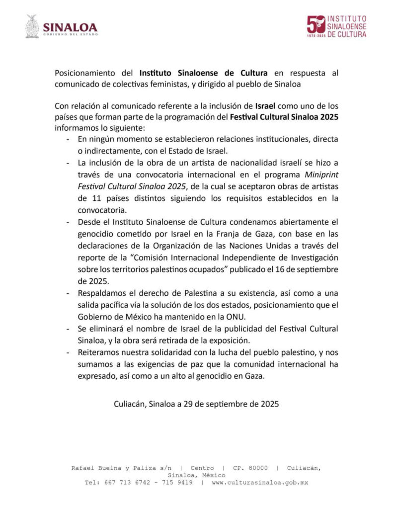 La inclusión de Israel en la programación del Festival Cultural Sinaloa 2025 generó polémica luego de que colectivas feministas denunciaran la participación del país, argumentando que podría interpretarse como un intento de “blanquear el genocidio en Gaza”.