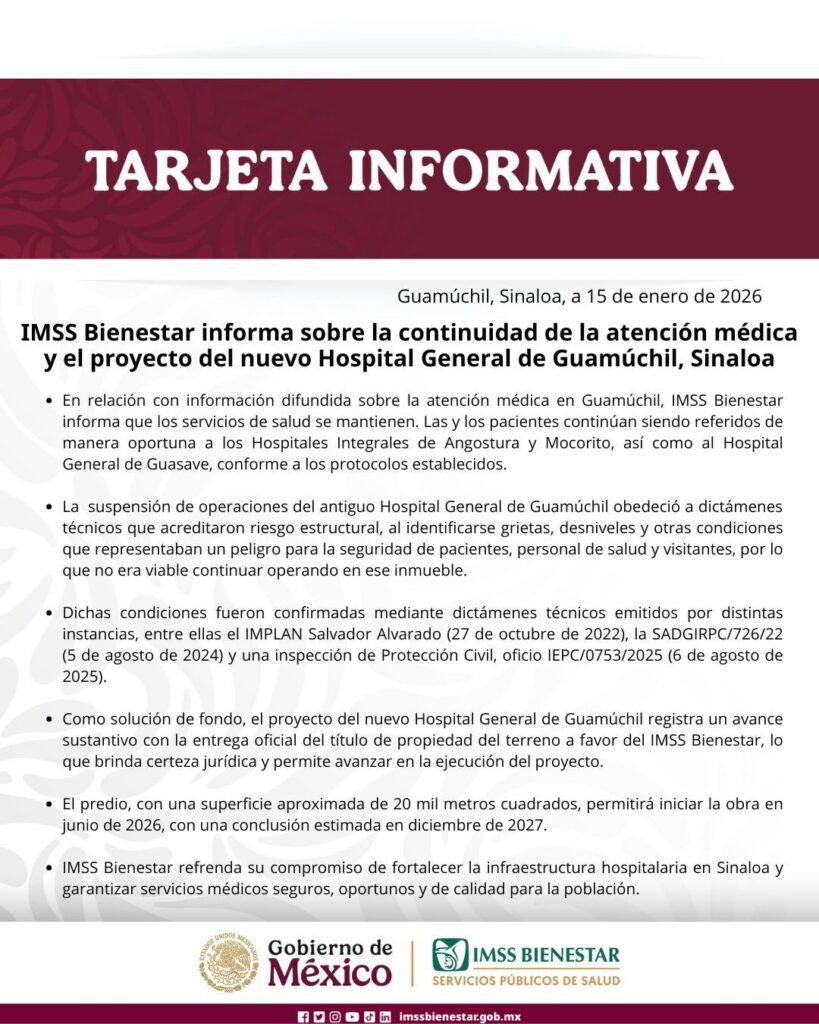Tras el encuentro, el IMSS Bienestar confirmó en redes sociales que la construcción del nuevo Hospital General de Guamúchil iniciará en junio de 2026, luego de que dictámenes técnicos determinaran que el antiguo inmueble presentaba riesgos estructurales que ponían en peligro a pacientes, personal de salud y visitantes, por lo que fue necesario suspender operaciones.