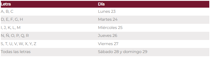 El calendario de atención se organizará según la letra inicial del primer apellido. El lunes 23 corresponde a las letras A, B y C; el martes 24, a D, E, F, G y H; el miércoles 25, a I, J, K, L y M; el jueves 26, a N, Ñ, O, P, Q y R; y el viernes 27, a S, T, U, V, W, X, Y y Z. El sábado 28 y el domingo 29 se atenderá a personas de todas las letras.